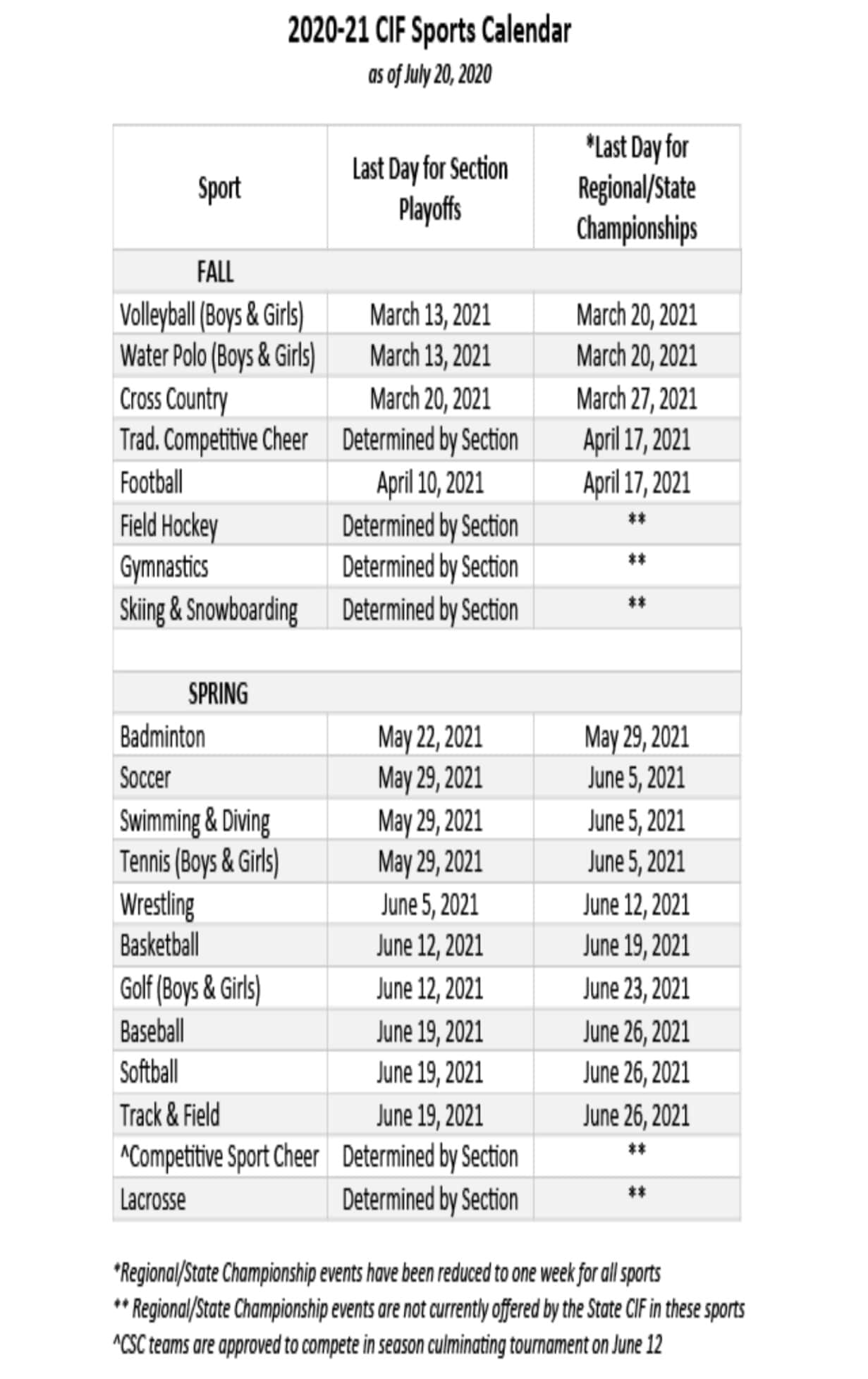 As per the 2020-21 sports calendar above, the CIF has made adjustments to the traditional seasons of sport. Each CIF Section will release their own calendar to reflect regular season starting and ending dates and Section playoffs. It is anticipated that most Section start dates will commence in December 2020 or January 2021.