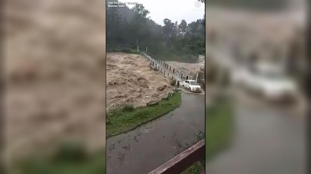WATCH: Vehicles cross bridge surrounded by rushing floodwaters